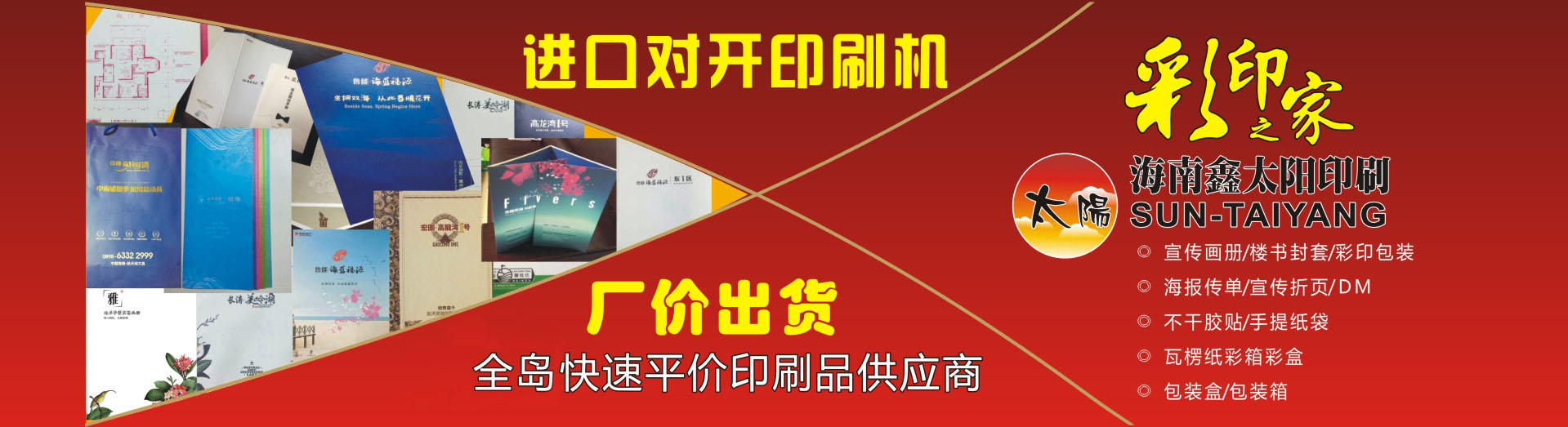 海南鑫太陽印刷業(yè)有限公司成立于2002年,主要從事生產(chǎn)海報畫冊、傳單簡介、精品包裝、掛歷臺歷、不干膠貼、手提紙袋、瓦楞紙包裝箱和彩箱紙盒等,公司有日本、德國等對開及四開高速彩色印刷機、自動膠裝機、自動鎖線機、自動復膜機等先進的自動化設備,業(yè)務涉及商業(yè)、地產(chǎn)、水產(chǎn)、食品、農(nóng)林、藥品、化工、航空等行業(yè)的彩印包裝及宣傳印刷品。我公司另外還設有紙箱包裝廠,可以更好地為客戶配套生產(chǎn)各種檔次級別的瓦楞紙箱彩盒、普通紙箱紙盒、精裝禮盒等大型產(chǎn)品包裝,產(chǎn)品范圍包括花炮箱、飲料箱、食品箱、魚箱、花箱等。
